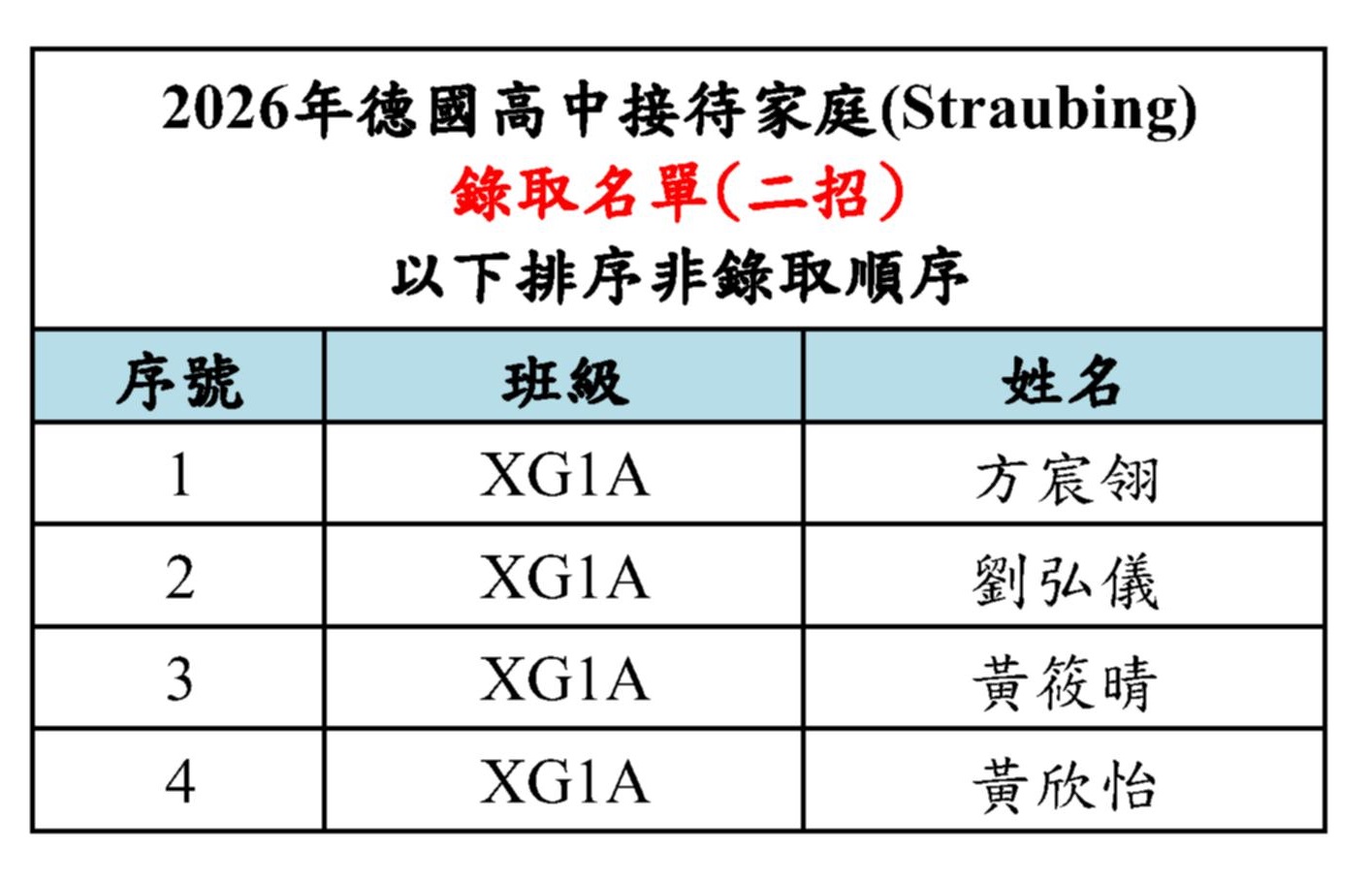 2026年德國高中接待家庭(Straubing)之錄取名單(二招)如下,敬請參閱。