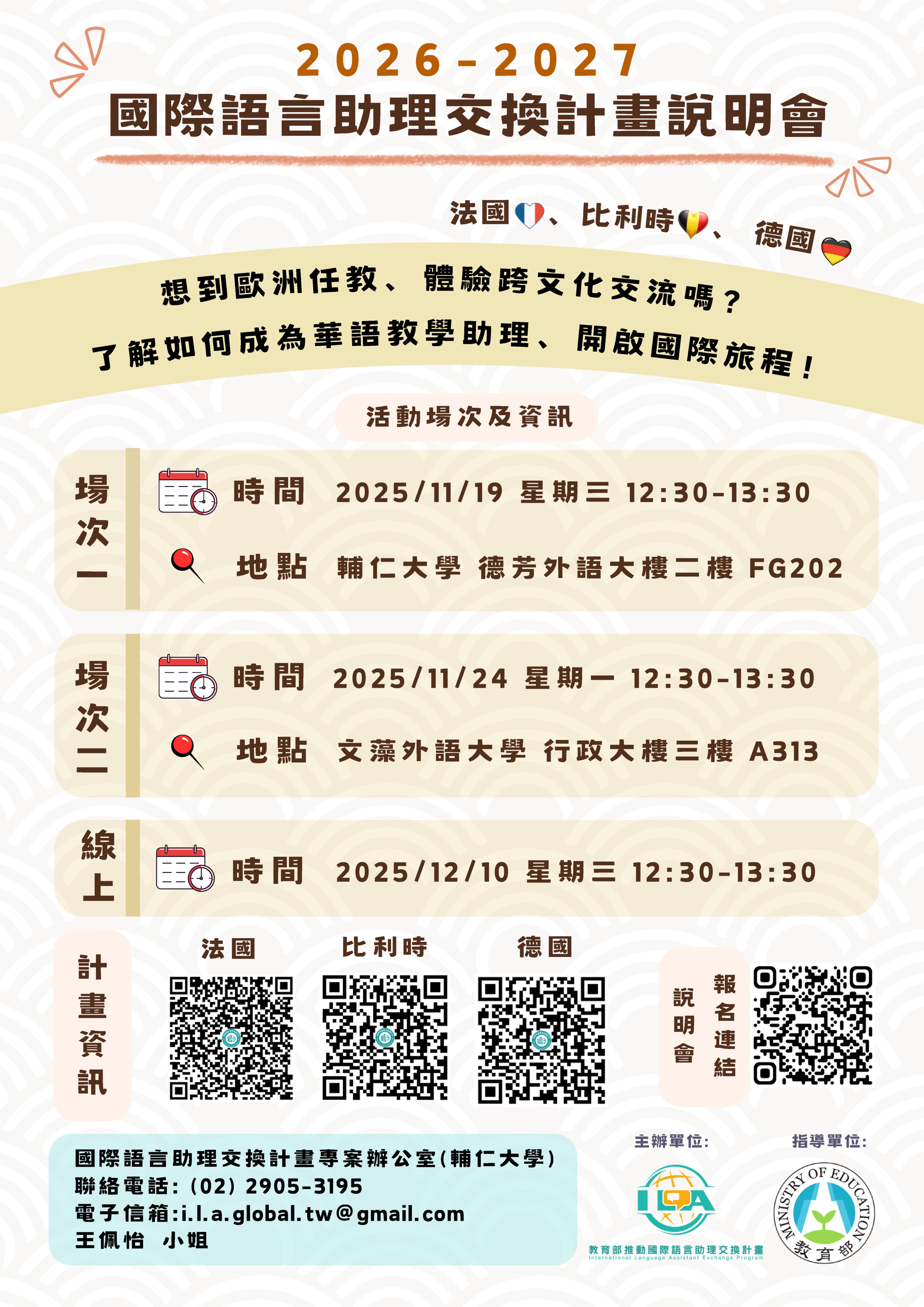 本次說明會將說明國際語言助理交換計畫的背景、內容與特色、申請資格與條件、申請流程與遴選標準、計畫時程與補助的資訊,並有問答時間供學生提問。