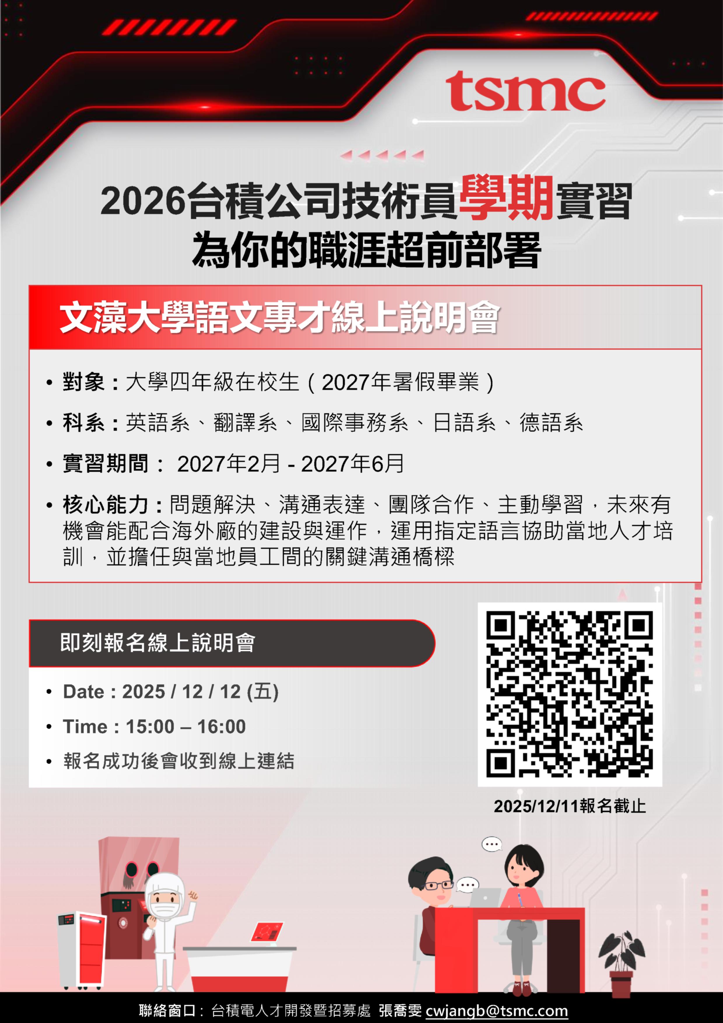 【歡迎參與】台積電2026 語文專才技術員「學期實習」 - 線上說明會