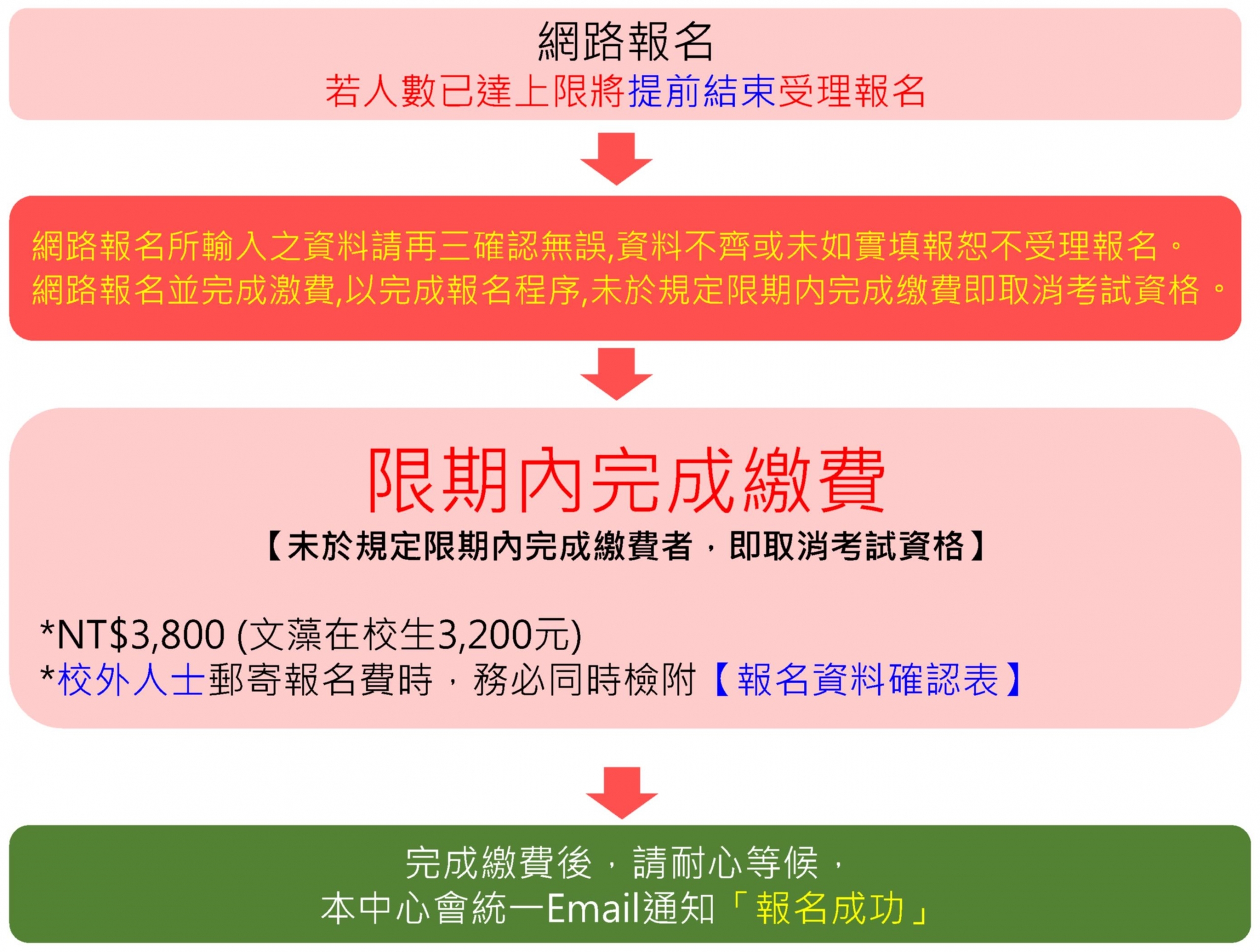 - 網路報名並完成繳交【報名費用及報名資料確認表】,以完成報名程序,未於規定限期內完成者即取消考試資格。
