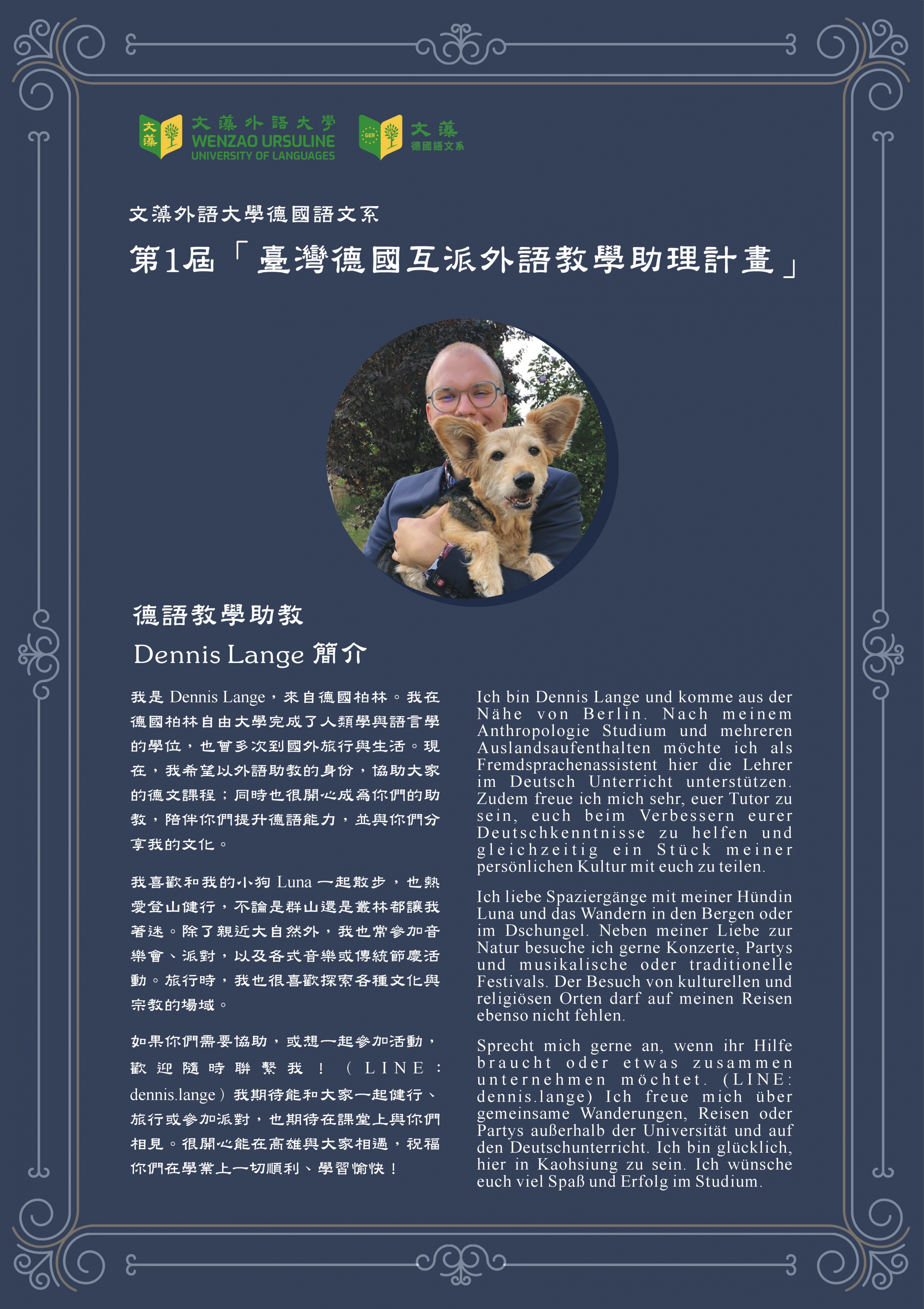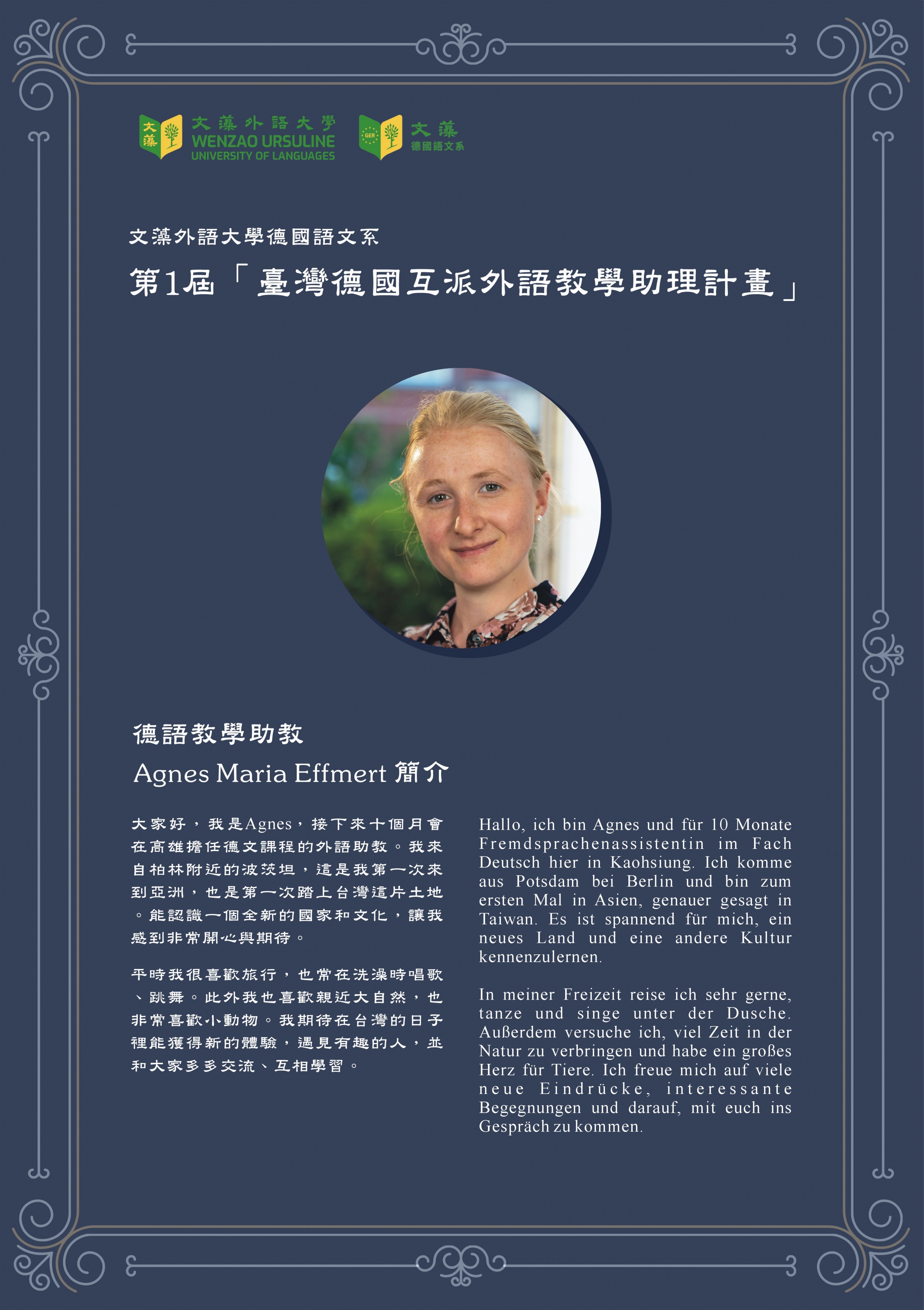 我們很高興兩位德語教學助理加入德文系大家庭,兩位助教將服務至2026年6月30日。