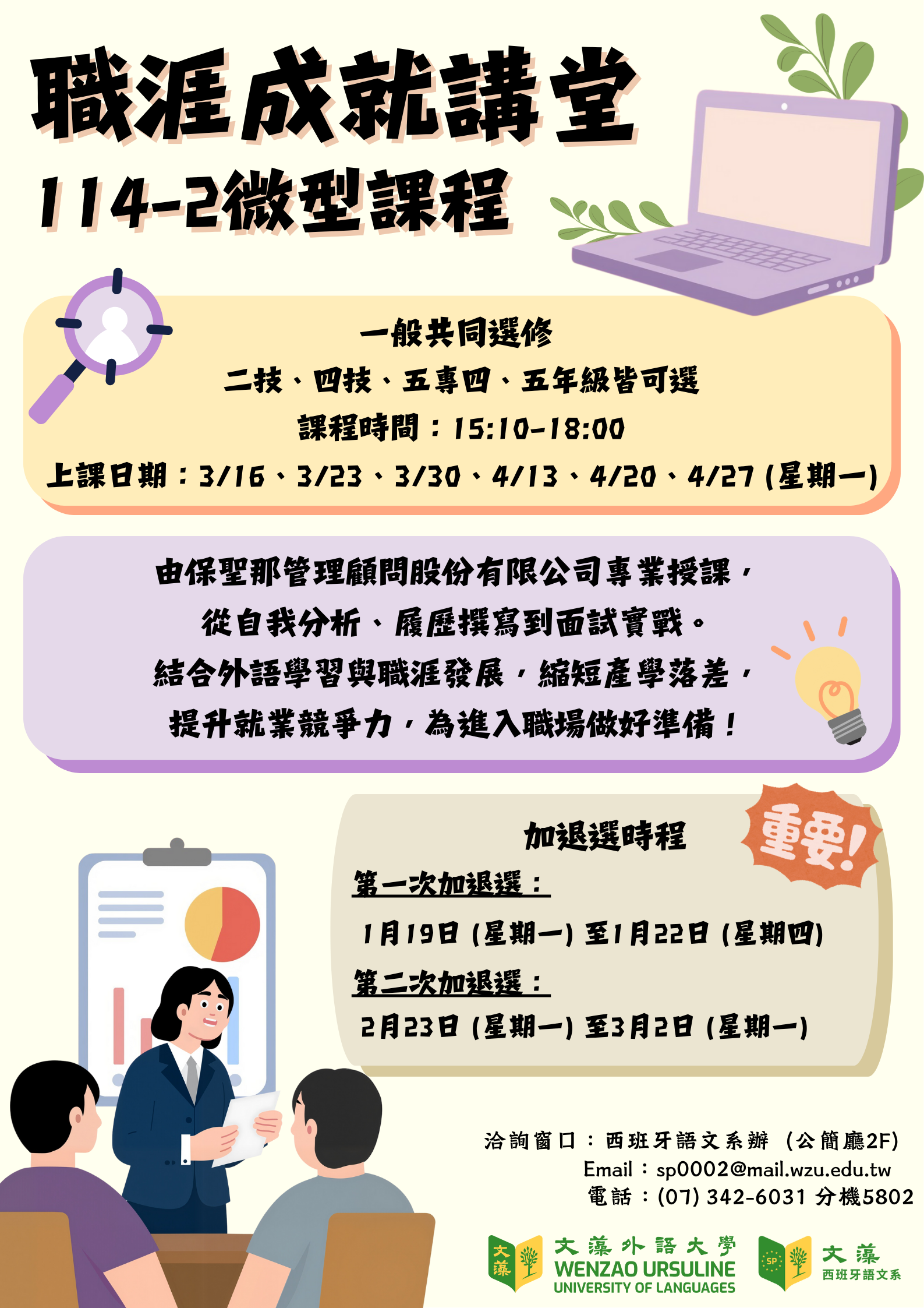 【轉知】歡迎選修西文系開設之「職涯成就講堂」(114-2學期)