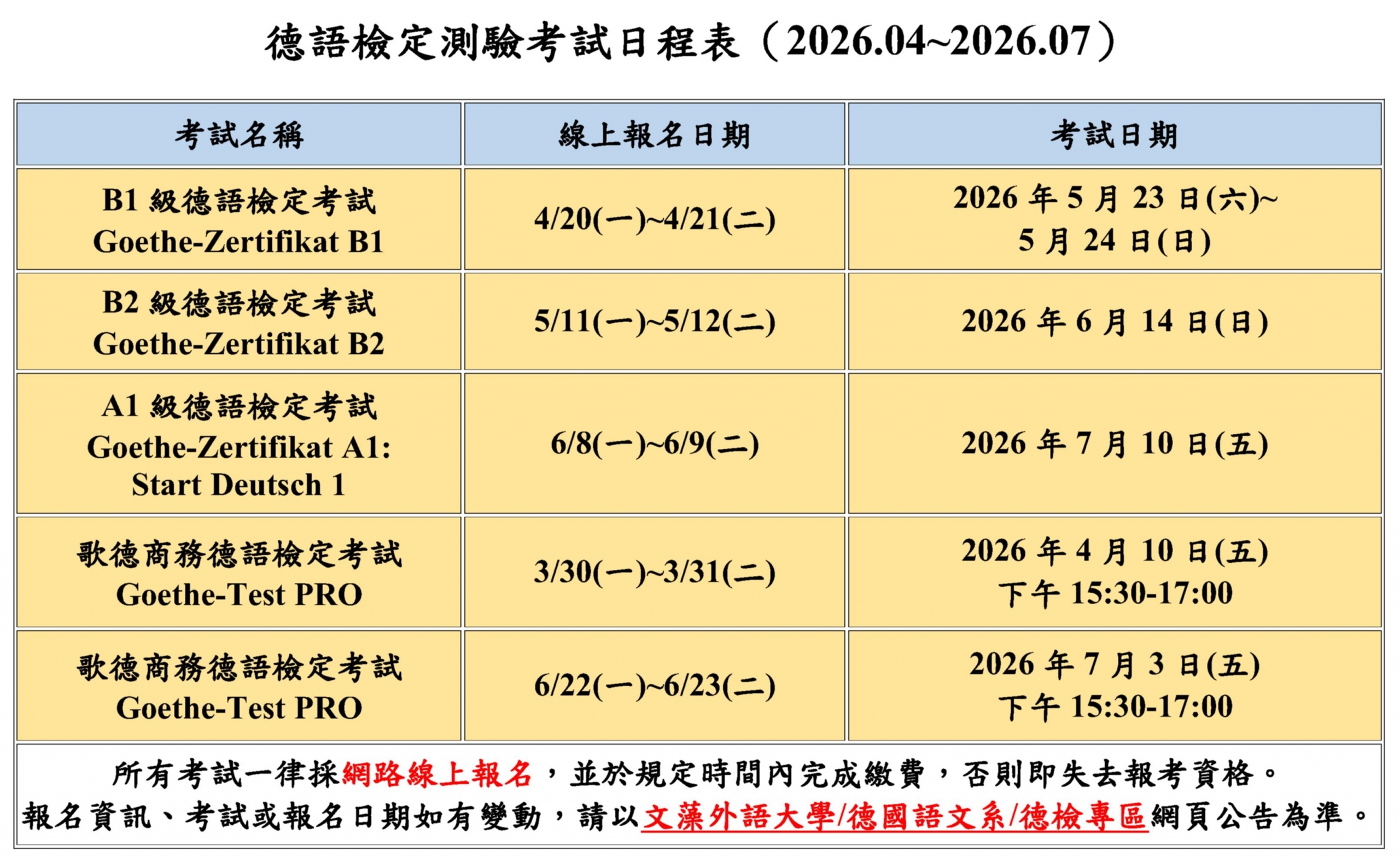 【公告】德語檢定測驗考試日程表(2026.04~2026.07)