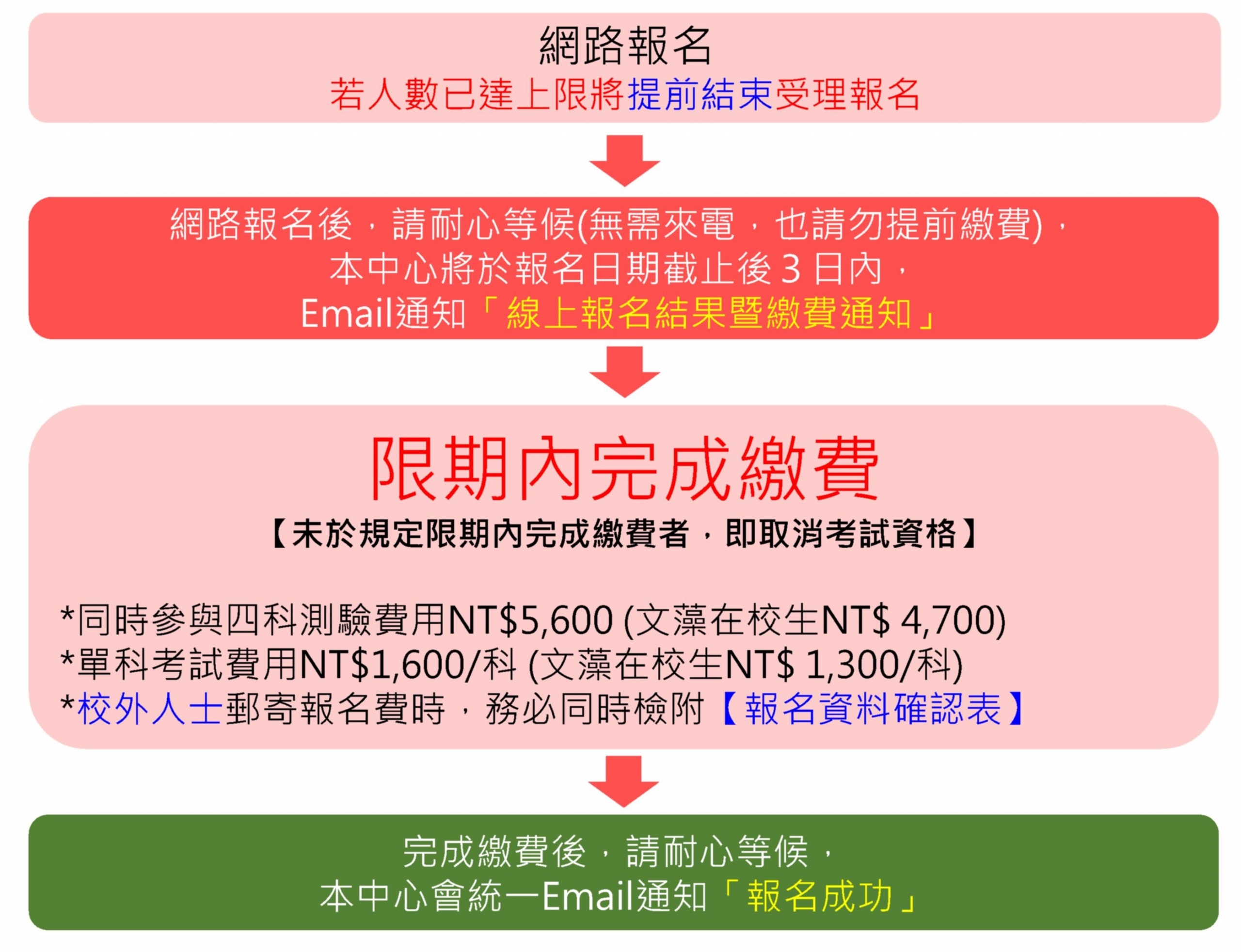 - 網路報名並完成繳費,以完成報名程序,未於規定限期內完成繳費即取消考試資格。