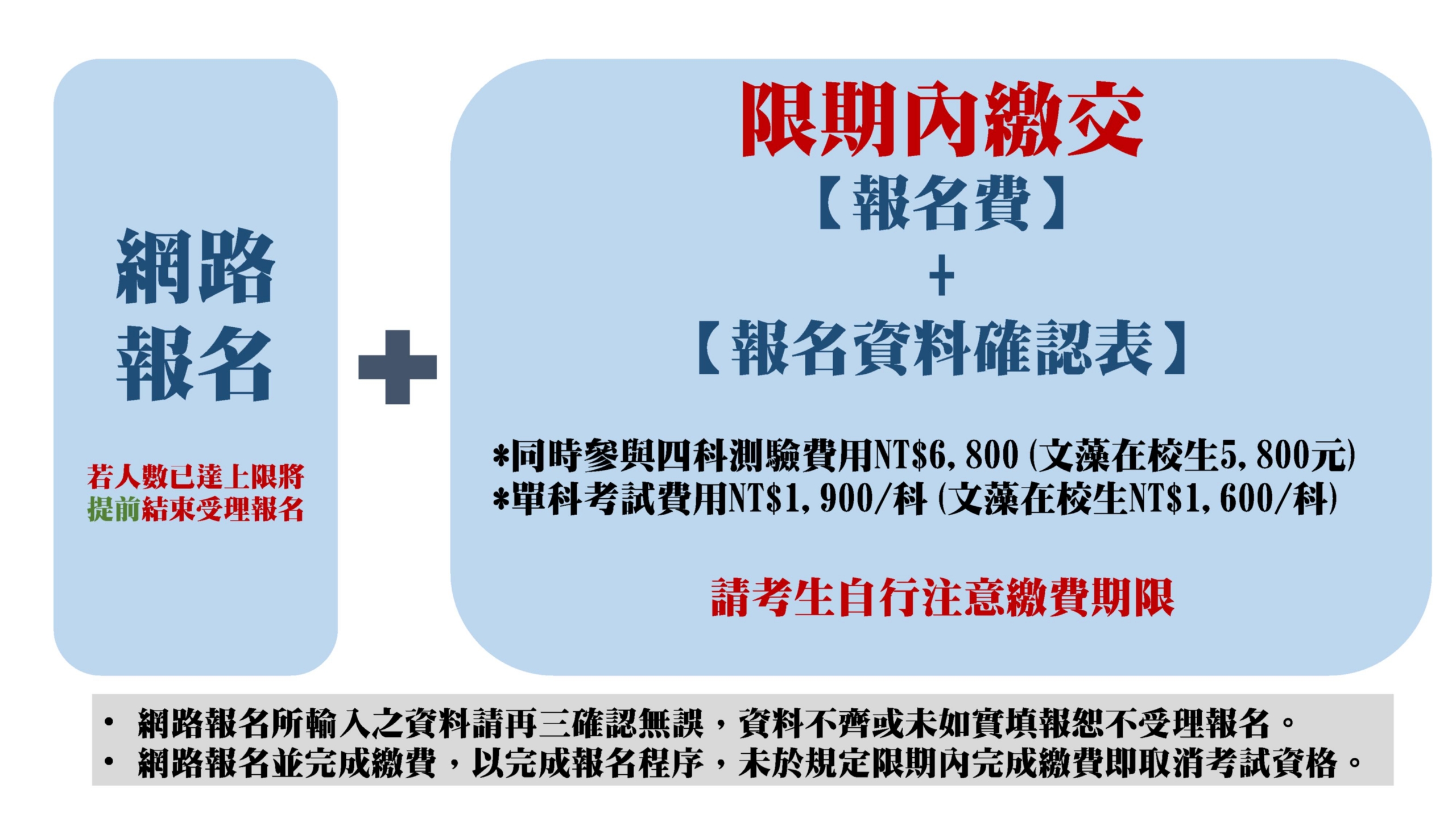 - 網路報名並完成繳交【報名費用及報名資料確認表】,以完成報名程序,未於規定限期內完成者即取消考試資格。